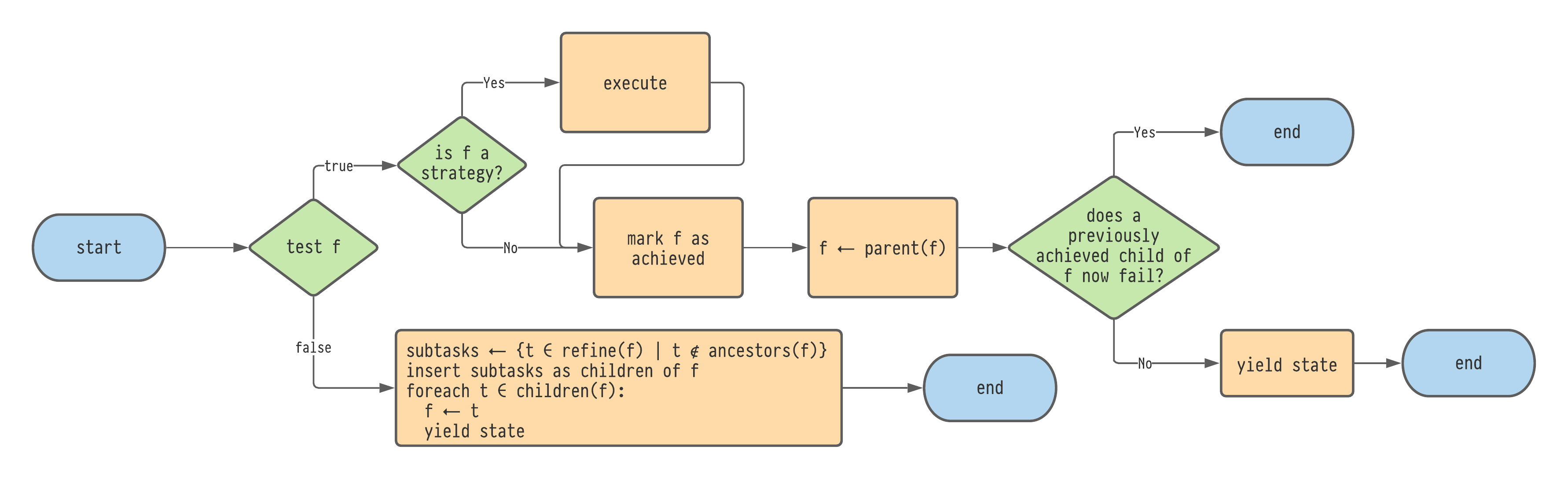 In the case that test(π) is false, meanwhile, the algorithm 'explores' the task tree by finding new child subtasks for π.