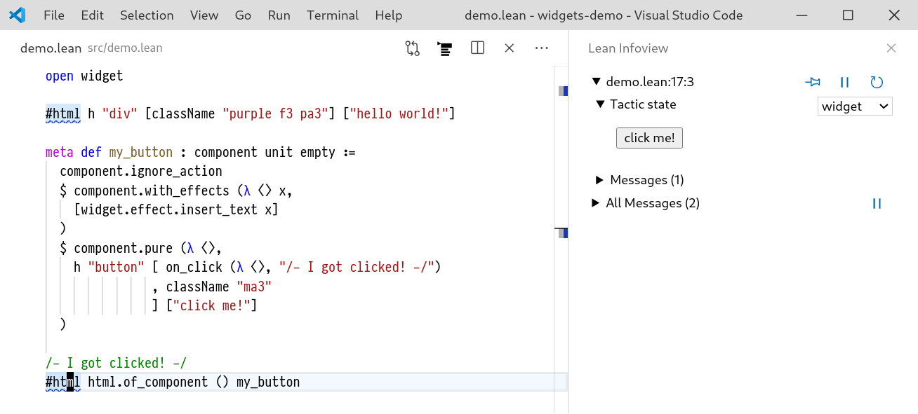 meta def my_button : component unit empty :=component.ignore_action$ component.with_effects (λ ⟨⟩ x,[widget.effect.insert_text x])$ component.pure (λ ⟨⟩,h "button" [ on_click (λ ⟨⟩, "/- I got clicked! -/"), className "ma3"] ["click me!"])#html html.of_component () my_button