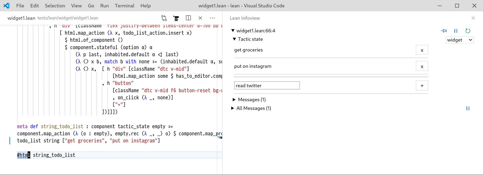 TodoItem := (label : String) × (done : Bool)TodoList := List TodoItemTodoAction ::=| mark_as_done (index : ℕ)| add_task (value : String)initial : TodoList :=[ ("get groceries", false), ("put on instagram", false)]update : TodoList → TodoAction → TodoState| 𝑠 ↦ (mark_as_done 𝑖) ↦ (𝑠 with 𝑠.l[𝑖].done ← true)| 𝑠 ↦ (add_task 𝑣) ↦ (𝑠 with 𝑠.l ← 𝑠.l ++ [(𝑣, false)])view : TodoList → Html TodoActionview l :=<ul>{l.mapi $ (i, label, done) ↦<li>{if done then "[x]" else "[ ]"}{label}{if not done then<button click={() ↦ mark_as_done i}>mark done</button>else []}</li>}<hr/><li> {textbox} </li></ul>